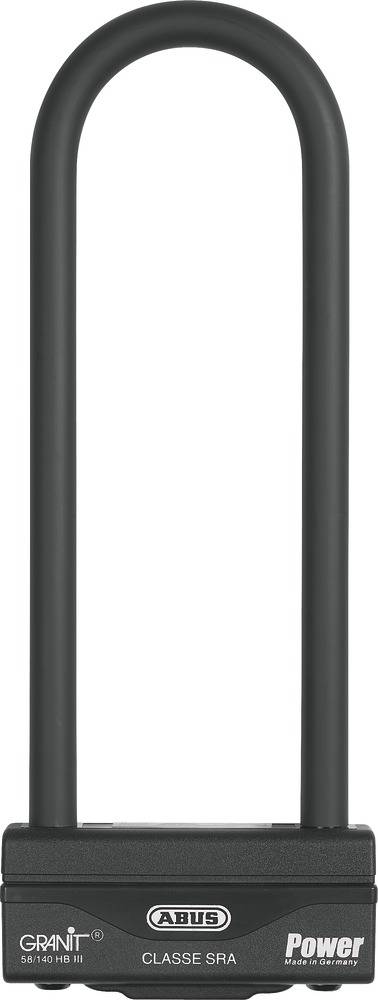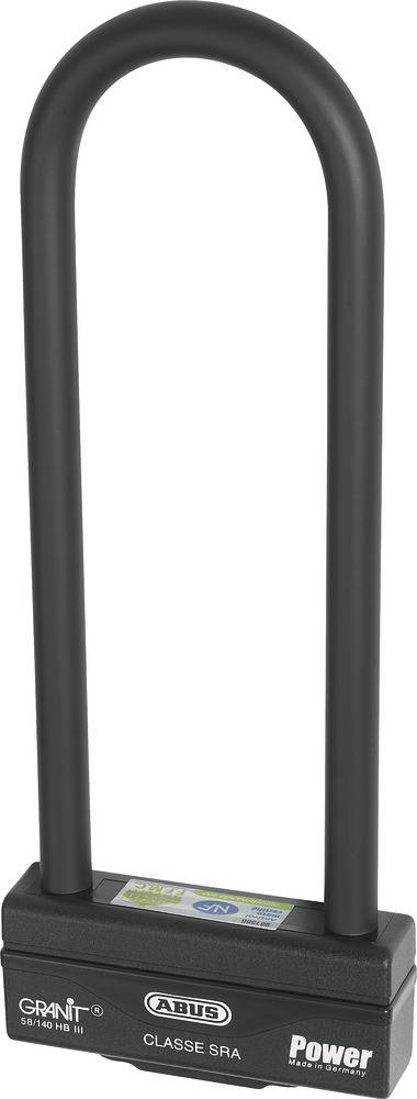 Het ABUS Beugelslot GRANIT Power 58 is voorzien van een 16 mm ronde beugel van gehard staal die optimale bescherming biedt tegen braak. Deze beugel is met hoes 18 mm dik. De breedte is 84mm en de diameter 18mm. Dit beugelsot is er ook in een kleinere variant: 58/140HBIII260 (260mm hoog), 2510 gram.