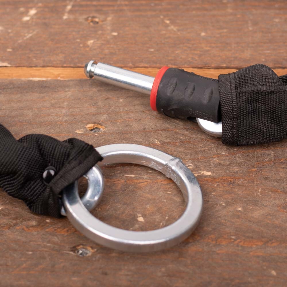Met de Chain ringslotketting is het dubbel beveiligen van uw fiets simpel. U legt de ketting om een vast object, haalt het kettinguiteinde met de sluiting door de ring en steekt deze daarna in de slotbehuizing. Een extra sleutel is niet nodig.
