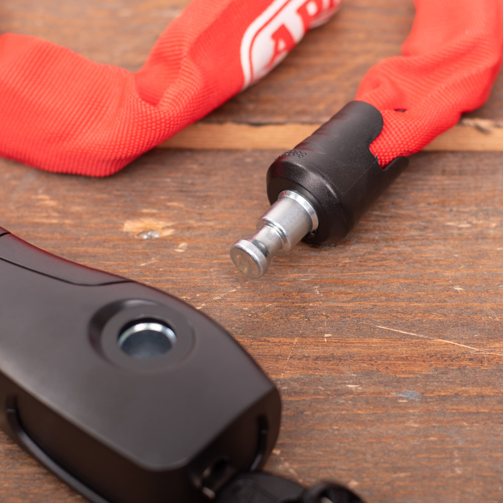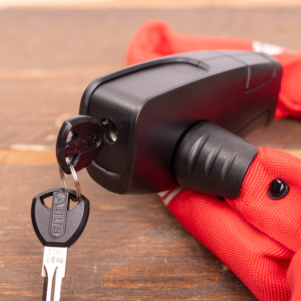 De ketting, het slothuis en de interne elementen van het slotmechanisme zijn gemaakt van speciaal gehard staal. De ketting heeft 7 mm dikke schakels en is voorzien van een stevige, rode beschermhoes die uw fiets tegen krassen beschermt.