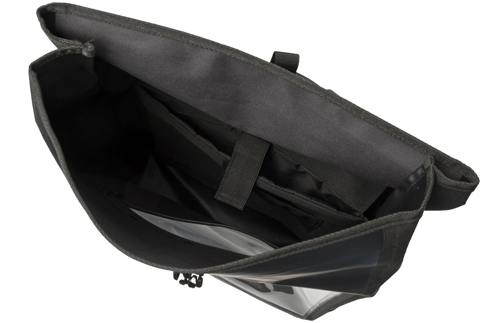 Het ruime hoofdvak is uitgerust met een gevoerd laptopvak, geschikt voor een 14 inch laptop. Op de voorkant van dit laptopvak bevinden zich twee steekvakjes, voor het opbergen van kleine spullen. Aan een van de zijkanten van de tas zit een opbergvak met een waterafstotende YKK-rits. En met het transparante, waterdichte insteekvak voor een logo of reclame in A3-formaat op de voorkant, is de tas een mobiele reclamedrager die opvalt in het straatbeeld.