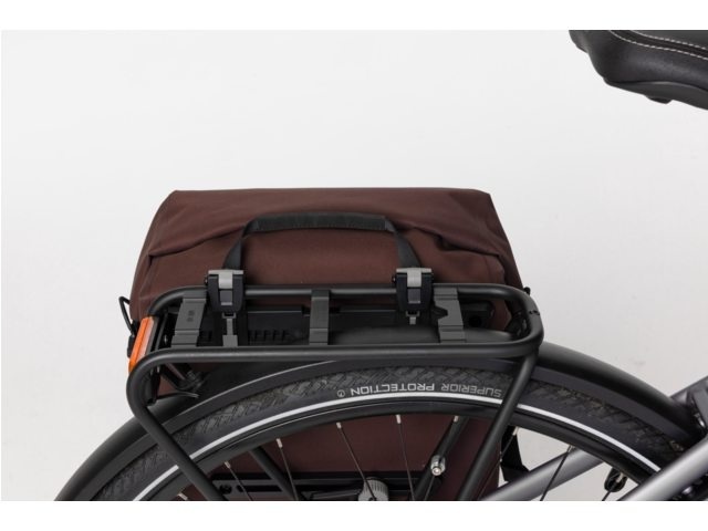 U bevestigt de tas eenvoudig aan de bagagedrager met de premium Click'nGo-haken van AGU. Deze 'railed hooks' kunnen in de breedte worden versteld, zodat deze altijd passen op uw bagagedrager. Wanneer u aan het handvat trekt dat gekoppeld is aan het haaksysteem, gaan de haken open zodat u de tas gemakkelijk van de fiets af kunt halen. Dankzij de AGU Click'nGo Swinglock blijft de tas op zijn plek en de AGU Click'nGo bottomguard beschermt de onderzijde van de tas. De fietstas is e-bike proof en past dus ook op de meeste elektrische fietsen.