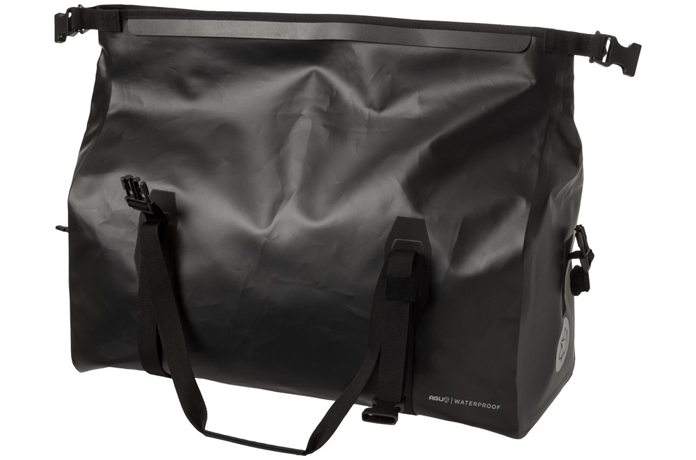 Vergroot de opbergruimte op je fiets met deze sterke, waterdichte Rackpack Shelter van AGU. De zwarte tas is gemaakt van stevig 100% waterdicht gerecycled polyester, en is voorzien van een rolsluiting, een draaggreep en een afneembare schouderband. Het is een ideale reistas, met ruimte voor ca. 30 liter aan spullen. De Rackpack kan worden gebruikt in combinatie met twee Shelter enkele fietstassen, doordat deze op een makkelijke manier aan elkaar te bevestigen zijn.