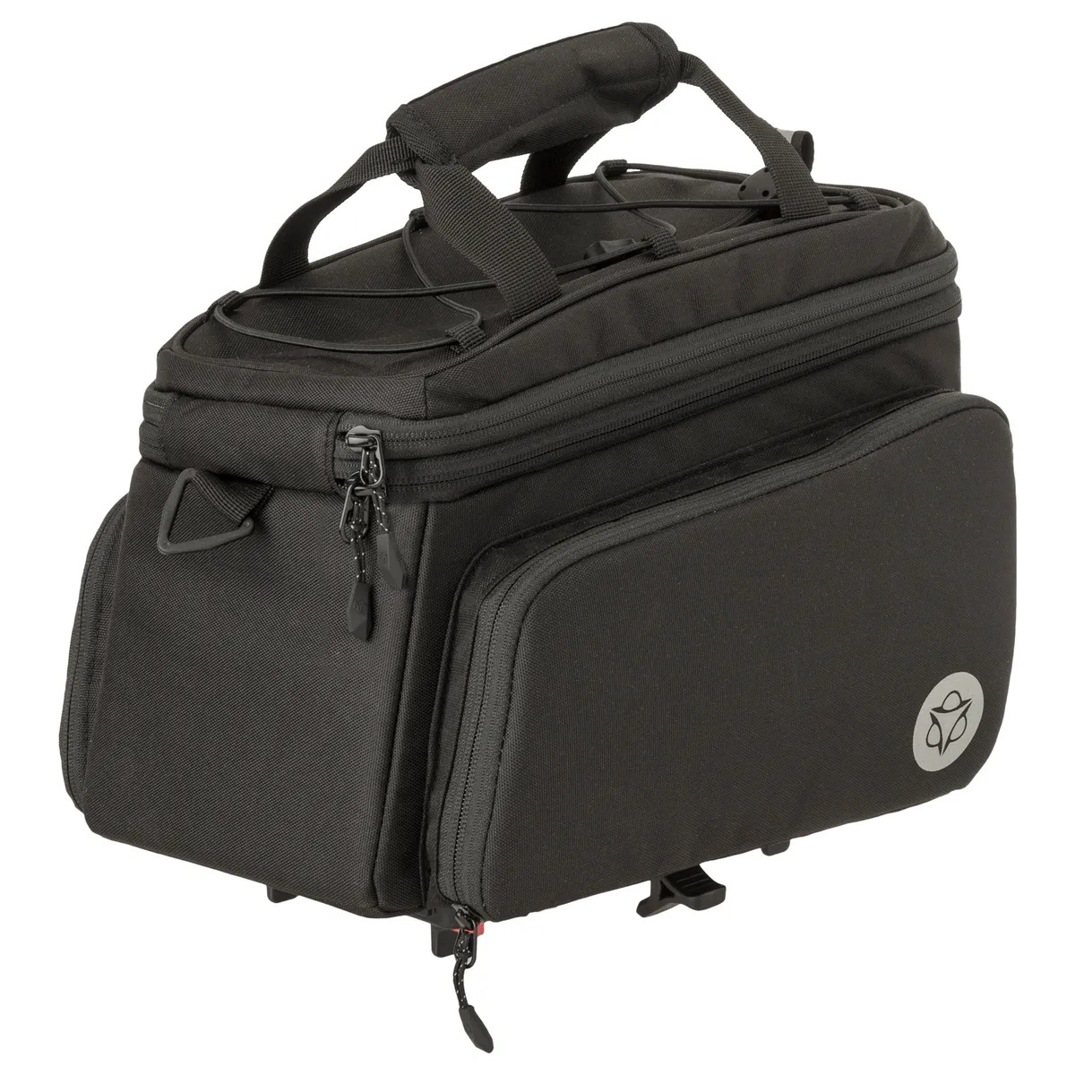 Bovenop de tas zit een opbergelastiek, om bijvoorbeeld een klein kledingstuk of regenjack onder te klemmen. En aan de achterkant van de tas zit een handige bidonhouder. Boven de houder zit een lusje, voor het bevestigen van een ledlichtje. Gaat u te voet verder? Dan draagt u de tas aan de afneembare schouderband of aan de draaggrepen. Deze draaggrepen zijn bijeen te houden met klittenband, zodat er één gemakkelijke handgreep ontstaat.