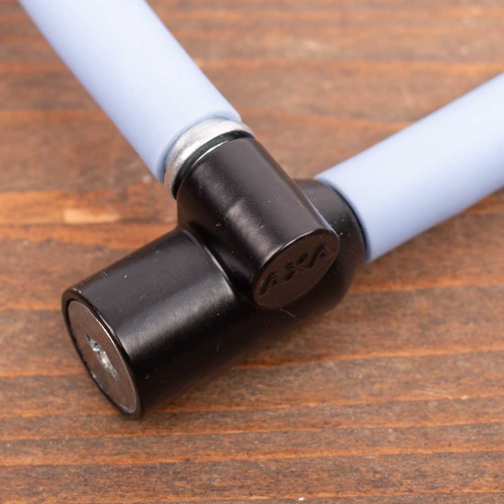 De kabel van roestvaststaal heeft een dikte van 6 millimeter en is voorzien van een lichtblauwe kunststof coating zodat de lak van de fiets niet wordt beschadigd.