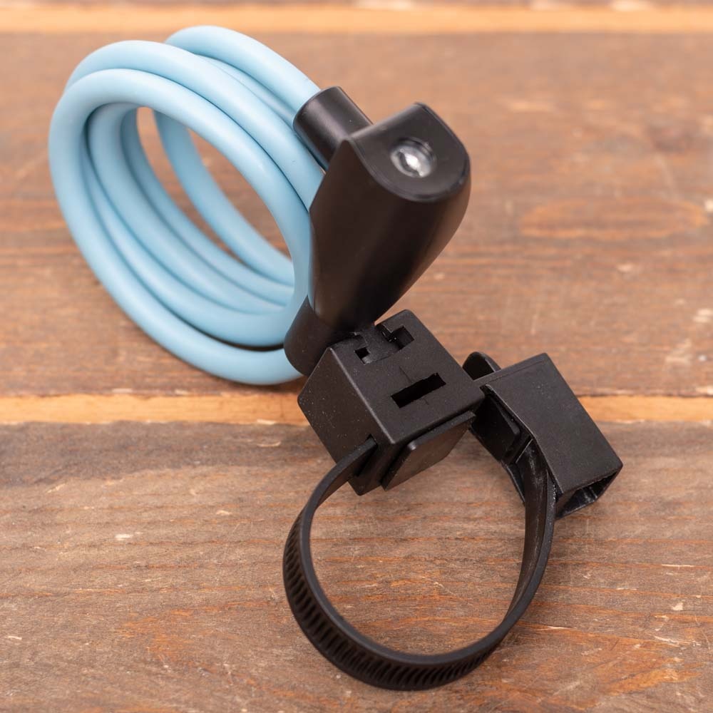 De kabel van roestvaststaal heeft een dikte van 8 millimeter en is voorzien van een lichtblauwe kunststof coating zodat de lak van de fiets niet wordt beschadigd.
