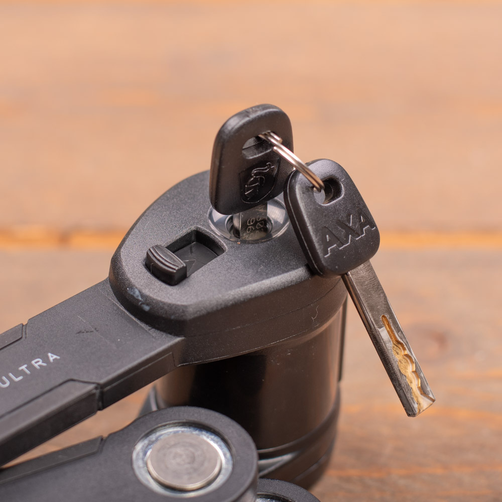 Het vouwslot wordt geleverd met de nieuw ontworpen click-bracket van AXA. Met één druk op de knop gaat de houder open en kan het slot eruit gepakt worden. Bij het terugplaatsen van het slot klikt u de houder weer dicht. Dankzij het antirammelmechanisme heeft u tijdens het fietsen geen last van een rammelend geluid. De houder kan op de bidonnokken gemonteerd worden, of aan de stang van de fiets vastgemaakt.