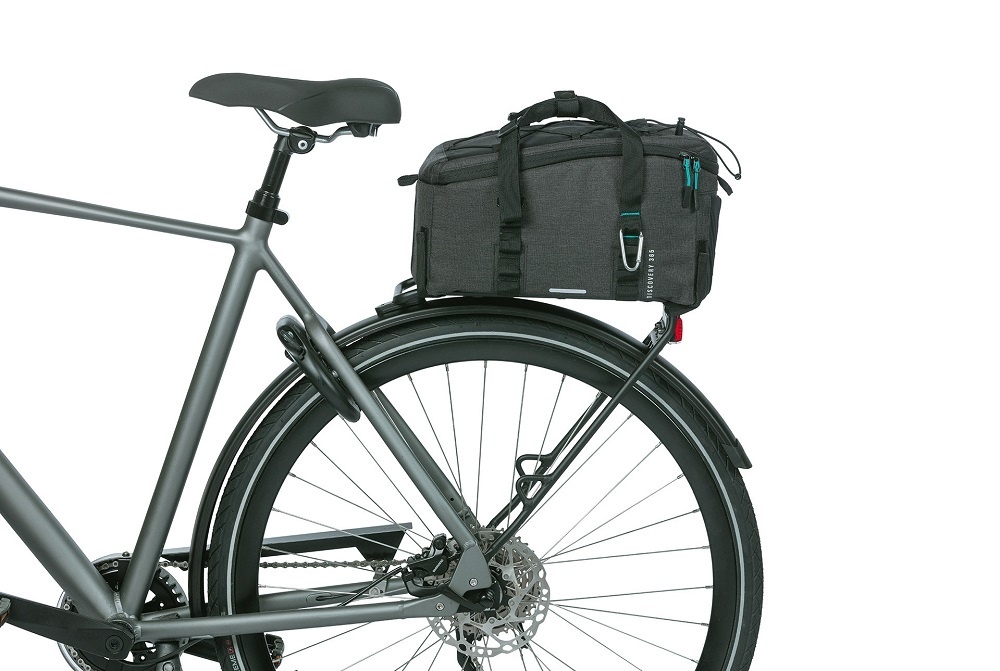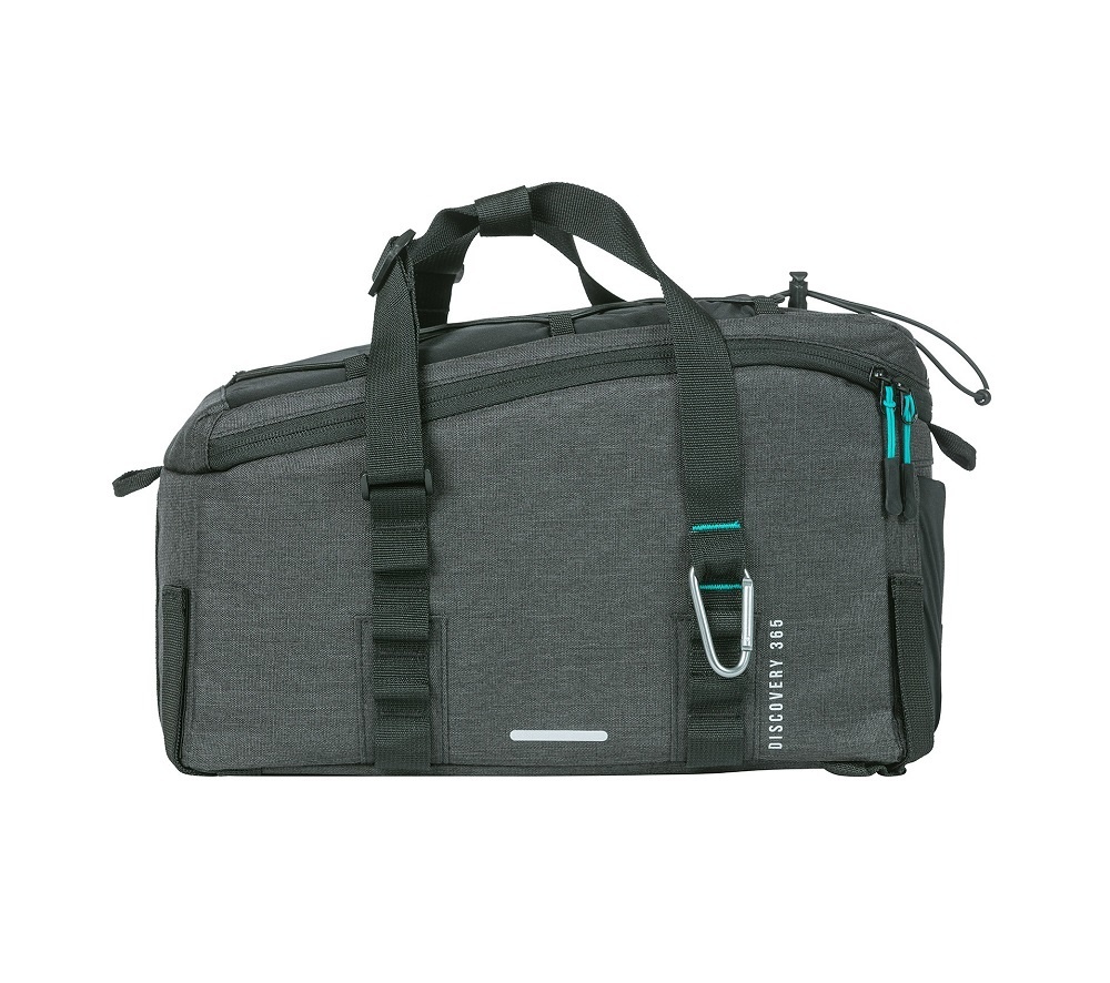 Deze sportieve bagagedragertas Discovery 365D van Basil is gemaakt van waterafstotend polyester, in gemêleerd zwart met turquoise accenten. De tas heeft een inhoud van 9 liter, een handig opbergelastiek, een afneembare schouderband en een losse regenhoes. De tas wordt op de drager bevestigd met klittenband, maar is ook geschikt voor MIK of Racktime.