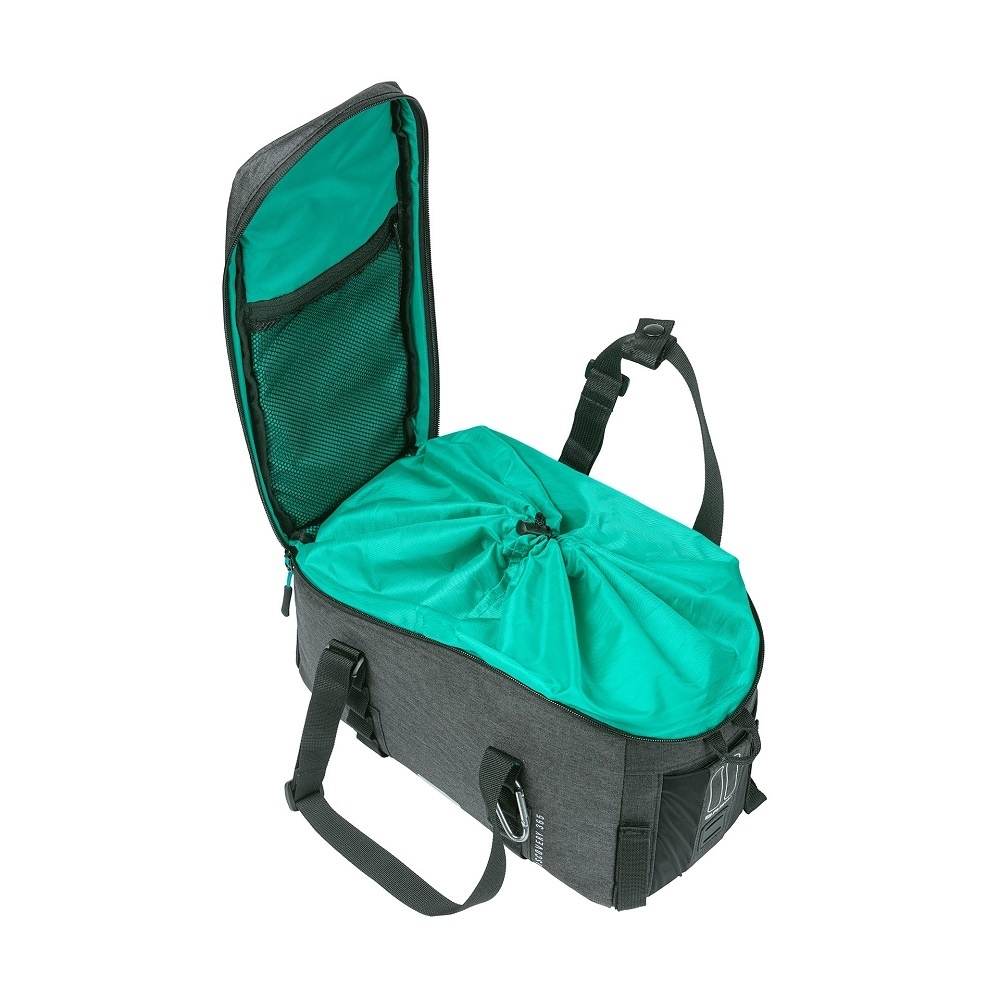 De trunkbag is ideaal voor kleine boodschappen of voor een dagje op pad met de fiets. Met ruimte voor bijvoorbeeld camera, een jas, flesje drinken, snacks, fietsslot, telefoon etc. De binnenruimte van ca. 9 liter is af te sluiten met een aansnoerkoord. Daar overheen komt een klep met een ritssluiting rondom. Aan de binnenkant van deze klep zit een ritsvakje van gaas. Aan de achterkant van de tas zit een elastisch opbergvak, bijvoorbeeld voor een drinkfles. Ook op de bovenkant van de klep zit een elastisch opbergvak, en elastiek om bijvoorbeeld een regenjas of fietshelm onder te klemmen, die zo voor het grijpen is.