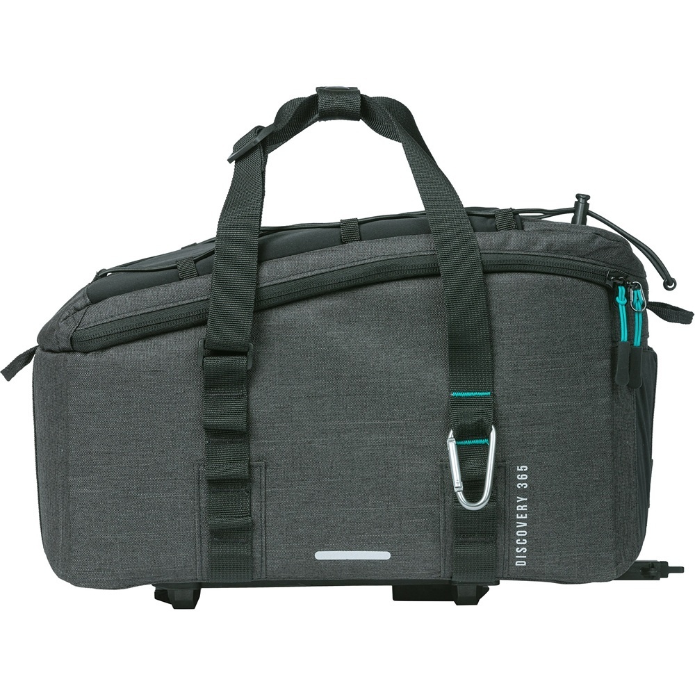 Deze sportieve bagagedragertas Discovery 365D van Basil is gemaakt van waterafstotend polyester, in gemêleerd zwart met turquoise accenten. De tas heeft een inhoud van 9 liter, een handig opbergelastiek, een afneembare schouderband, een losse regenhoes en een voorgemonteerde MIK 2.0-adapterplaat. Dankzij de bevestigingsmethode MIK is de tas ook perfect te gebruiken op een elektrische fiets.