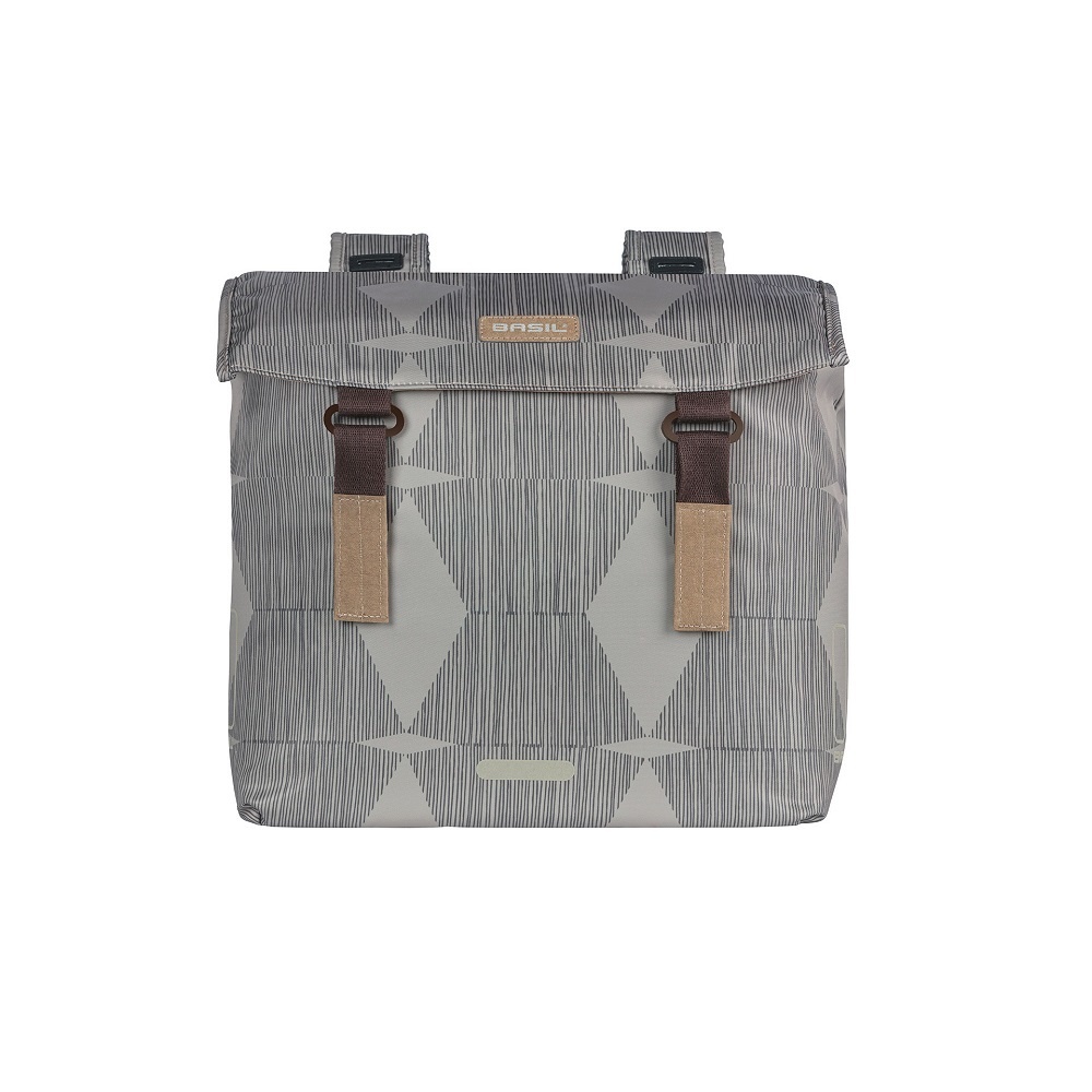Een dubbele fietstas die gemaakt is voor gebruik in de stad, dat is deze stijlvolle Basil Elegance. U neemt er gemakkelijk al uw spullen in mee. De tas is uitgevoerd in de mooie kleur 'Chateau Taupe' met een zwart streepjespatroon. De Elegance is waterafstotend, gemaakt van gerecycled materiaal en eenvoudig op uw fiets te bevestigen met het MIK-systeem.