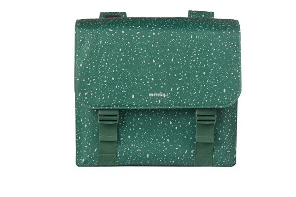 De dubbele fietstas Flair van het merk Basil heeft een inhoud van 35 liter en is gemaakt van waterafstotend gerecycled polyester. De trendy tas is uitgevoerd in het donkergroen, met een lichtgroene retro print geïnspireerd op de jaren '70. Een leuke fietstas waarmee u gezien mag worden!