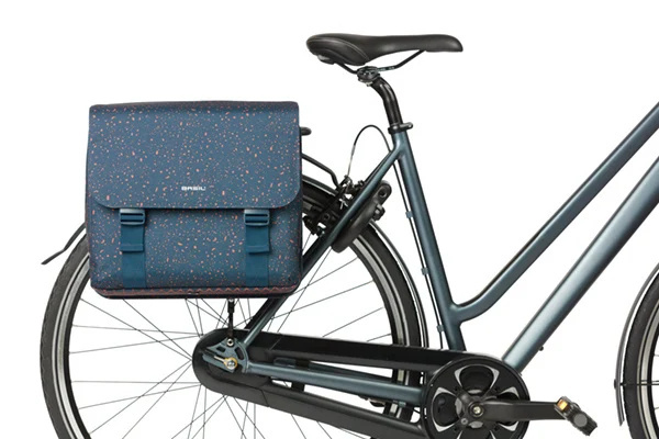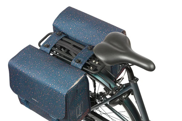 De dubbele fietstas Flair MIK van het merk Basil heeft een inhoud van 35 liter en is gemaakt van waterafstotend gerecycled polyester. De fietstas is uitgerust met een voorgemonteerde MIK 2.0-adapterplaat. De trendy tas is uitgevoerd in het marineblauw, met een roodbruine retro print geïnspireerd op de jaren '70. Een leuke fietstas waarmee u gezien mag worden!