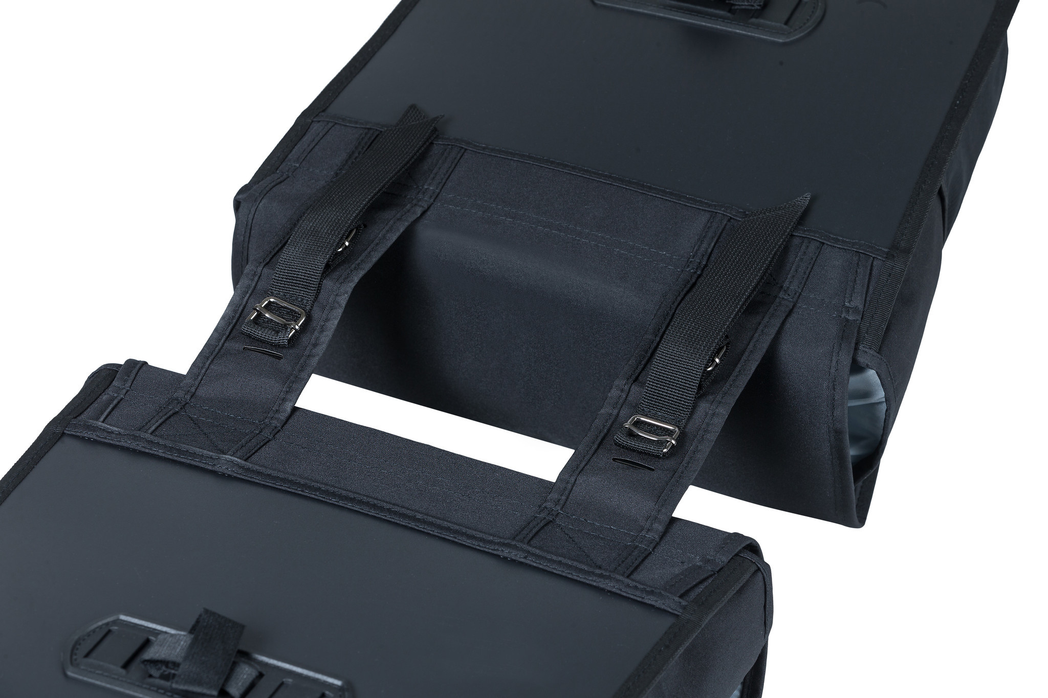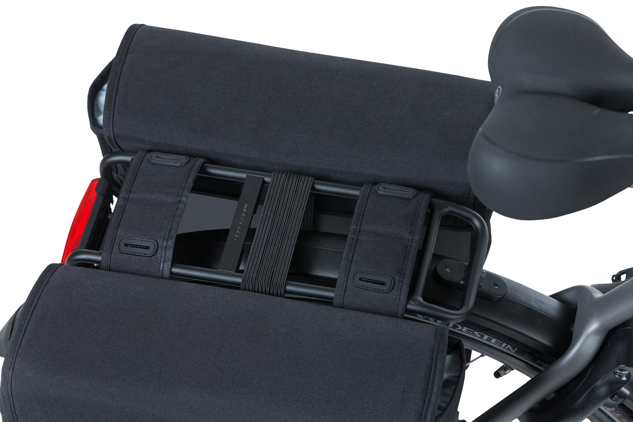 De Basil Go bevestigt u eenvoudig aan uw bagagedrager met de verstelbare riempjes. De bovenzijde (tussen de tassen) bestaat uit twee banden, zodat de snelbinders van uw fiets toegankelijk blijven. Het Universal Bridge-systeem zorgt ervoor dat de tas ook geschikt is voor gebruik in combinatie met systemen als MIK, Racktime en i-Rack/Carrymore (adapterplaat niet inbegrepen). Met een dergelijk systeem is de fietstas gemakkelijk van de fiets af te pakken.