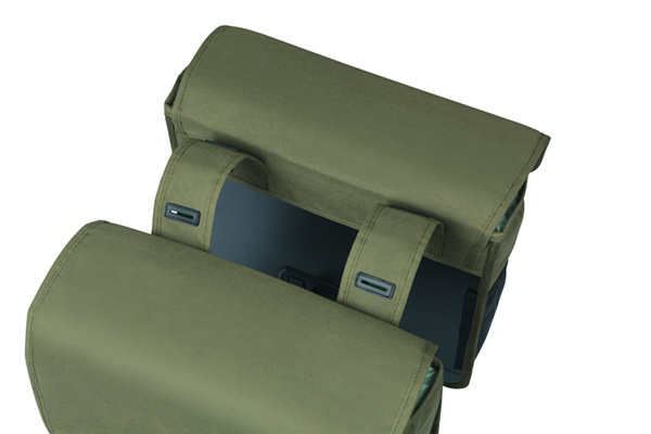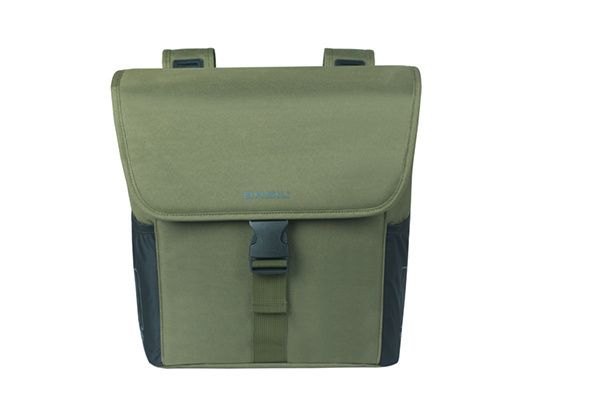 De dubbele fietstas GO van Basil heeft een ruime inhoud van 32 liter en is gemaakt van waterafstotend polyester. De tas is uitgevoerd in het groen en voorzien van reflecterende elementen.