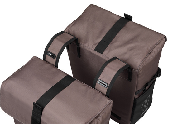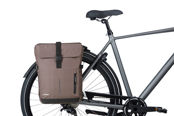 De sportieve dubbele fietstas Move van Basil heeft een inhoud van ruim 30 liter en is gemaakt van waterafstotend gerecycled polyester. De tas is uitgevoerd in het bruin en voorzien van reflectie, zijvakken en een regenhoes. De fietstas is zeer geschikt voor dagelijks gebruik en recreatieve ritten.