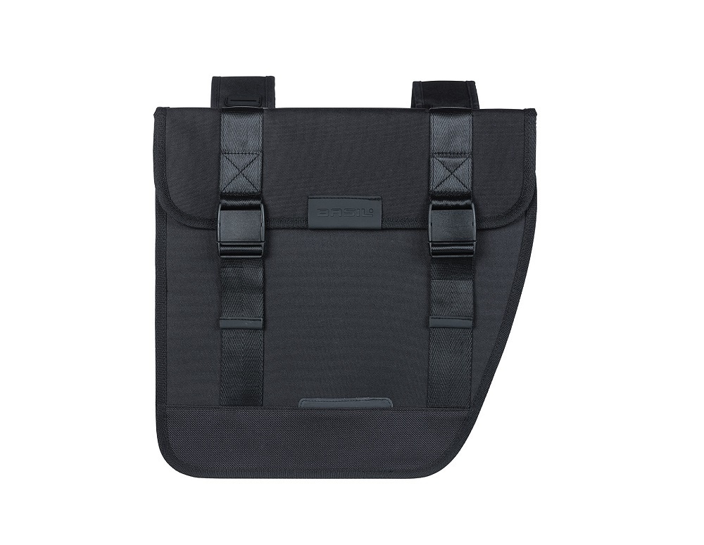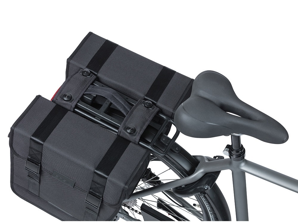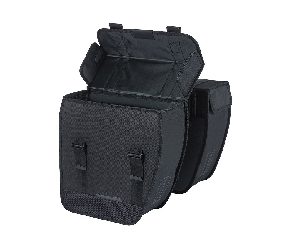 Fietstas Tour van Basil is vernieuwd! De dubbele zwarte fietstas is extra stevig en heeft een inhoud van 28 liter. De fietstas heeft afgeschuinde zijkanten, zodat u makkelijker kunt trappen zonder tegen uw tas te komen. Nieuw aan de tas zijn de eenvoudig bedienbare klikgespen, de ton-sur-ton-reflectie en bevestiging met het MIK 2.0-systeem.