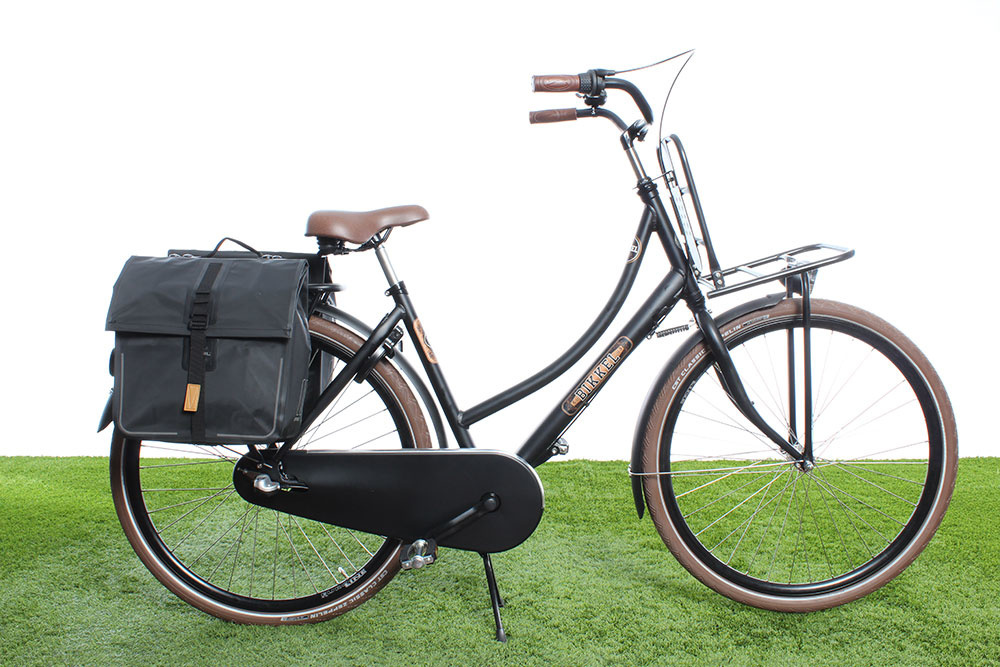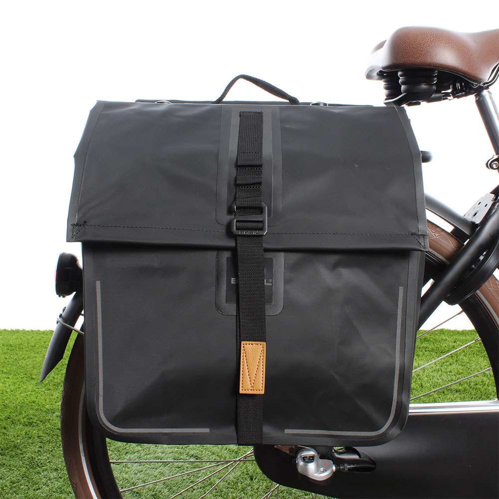 De ruime dubbele fietstas is gemaakt van stevig, waterdicht tarpaulin. De gelaste naden en vouwsluitingen zorgen ervoor dat deze tas bestand is tegen een stevige Hollandse regenbui. Waterdicht is dan ook echt waterdicht. De vouwsluiting wordt vastgezet met een verstelbare zwarte haak.
