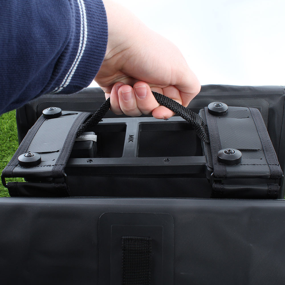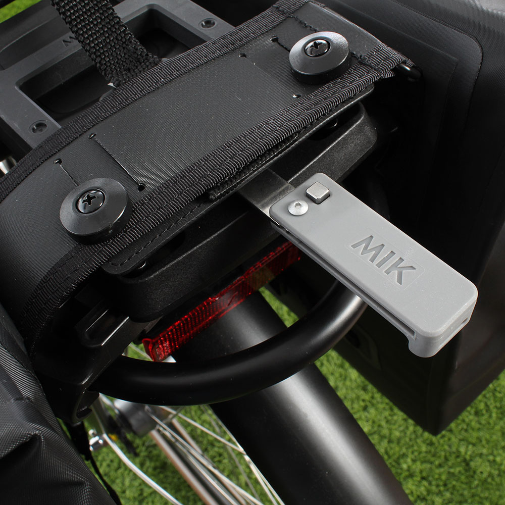 Deze Basil Urban Dry MIK is voorzien van een voorgemonteerde MIK 2.0-adapterplaat, waarmee u de tas heel eenvoudig op een MIK-bagagedrager plaatst en er ook net zo makkelijk weer van af haalt. De zwarte kunststof MIK 2.0 adapter is voorzien van een slot. Als u niet over een MIK-bagagedrager beschikt, kunt u de fietstas met behulp van een MIK-carrierplaat bevestigen (niet inbegrepen). Deze MIK-carrierplaat is apart verkrijgbaar en vindt u bij de gerelateerde producten. Meer informatie over het MIK-systeem leest u hier. Met het bandje onderaan de achterplaat bevestigt u de tas extra stevig op uw fiets.