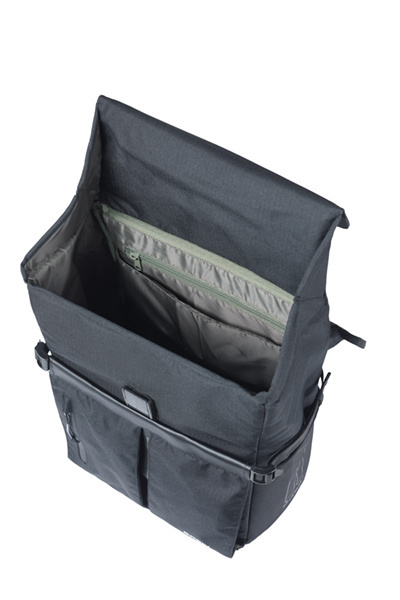In het hoofdvak van de Basil Move zit een ritsvak en een gewatteerd laptopvak, voor het veilig meenemen van een (kleine) laptop of tablet. De tas sluit met een klep met een klikgesp. Voorop zit een extra ritsvakje en de tas heeft elastische zijvakken. Aan de voorkant zit een verstelbaar helmvak, perfect voor het meenemen van een helm of voor het opbergen van een regenjack. De achterkant van de tas is verstevigd met een harde achterplaat en de tas is aan drie zijden voorzien van reflecterende elementen. Tijdens een hevige regenbui houdt de meegeleverde groene regenhoes de inhoud van de tas droog.