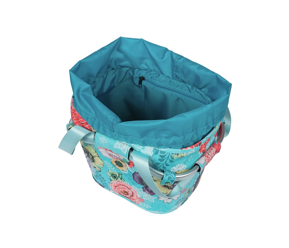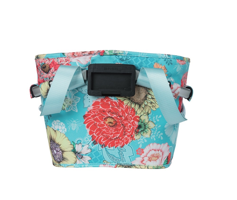 De Bloom Field Carry All Front Basket van Basil is een lichtgewicht fietsmand voor voorop de fiets. De mand biedt ruimte voor 15 liter aan spullen en is gemaakt van sterk, waterafstotend polyester. De stoffen Bloom Field-fietsmand is uitgevoerd in het turquoise/blauw, met een vrolijke bloemenprint.