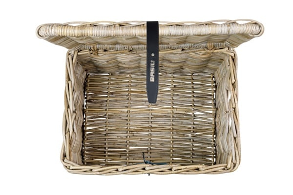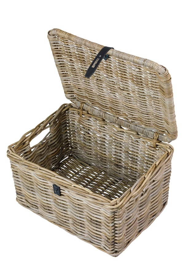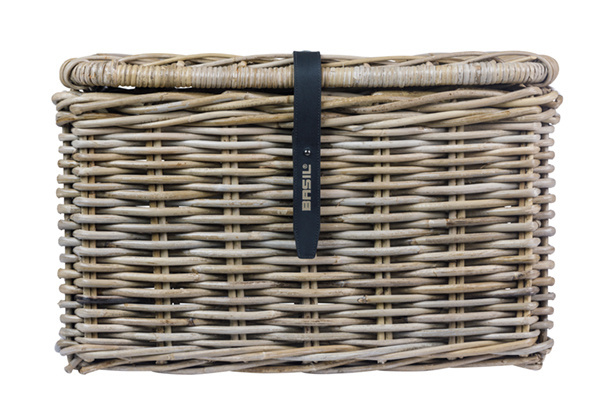 Naast fietstassen en fietskratten levert Basil ook hippe en fraaie fietsmanden. Zoals deze ruime grijze fietsmand met klep, gemaakt van sterk rotan. De Dax in maat L heeft een inhoud van ongeveer 34 liter. De mand heeft een handig deksel met lederen sluiting, om uw spullen veilig en beschermd te vervoeren.