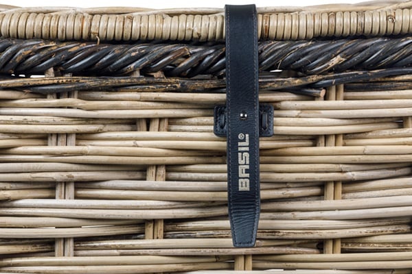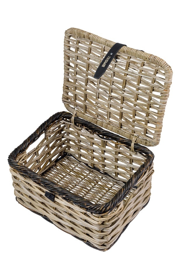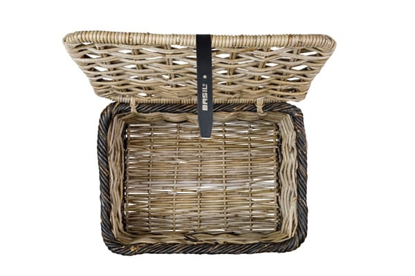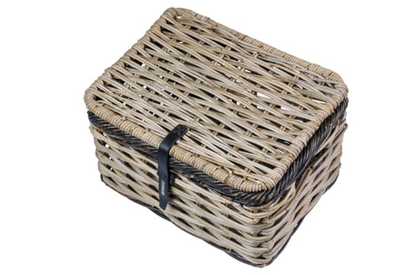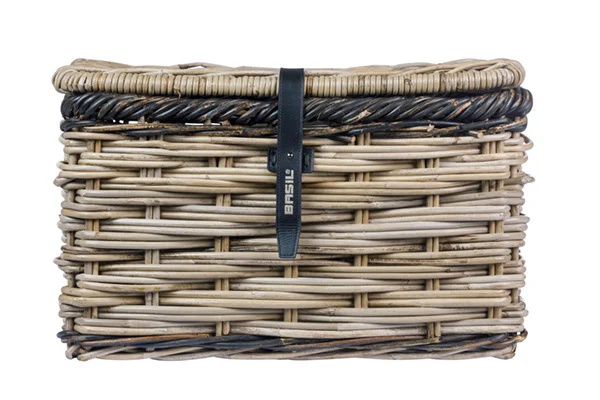 Vervoer uw spullen in stijl met deze fietsmand met klep van Basil, voor op de voordrager. De Basil Dijon is een grijze met zwarte fietsmand van rotan en heeft een inhoud van ongeveer 34 liter.