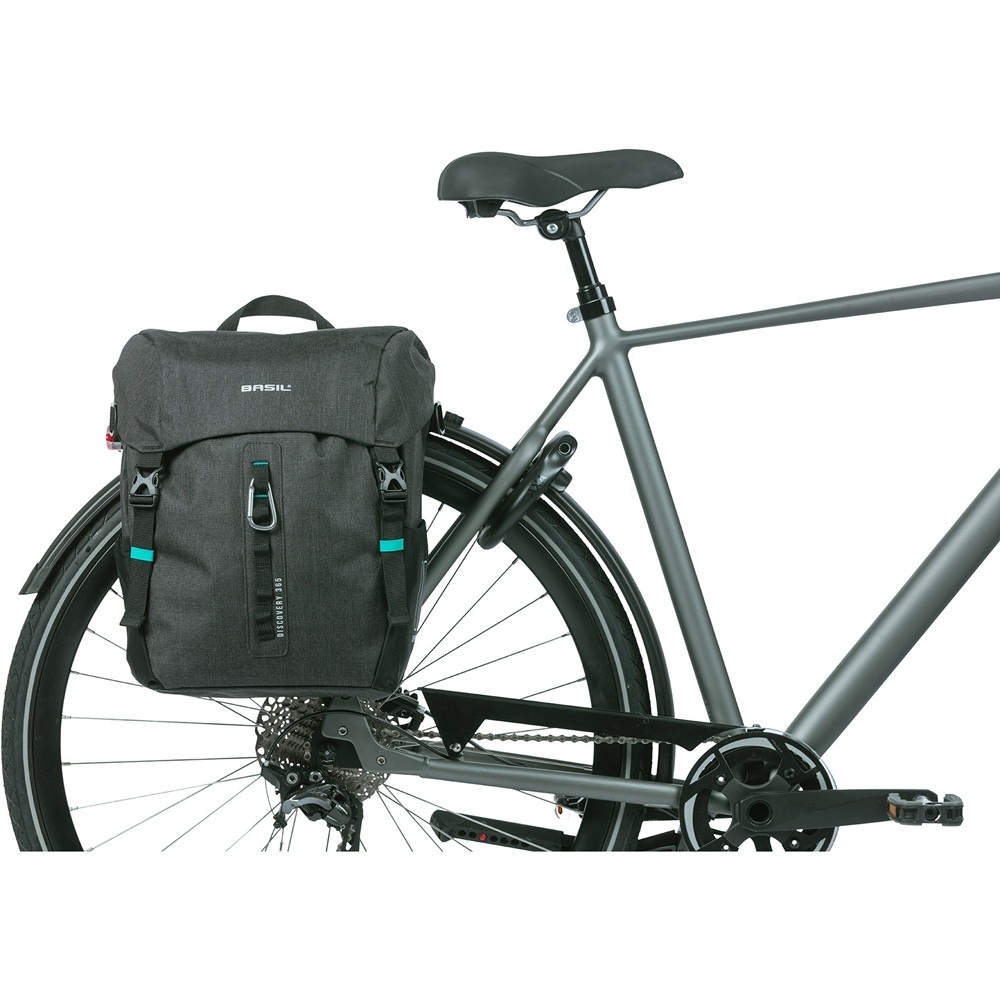 Een sportieve enkele fietstas van het merk Basil voor dagelijks gebruik. De Discovery 365D in maat L biedt ruimte voor ca. 20 liter aan spullen en is uitgevoerd in de kleur gemêleerd zwart, met turquoise details voor een fris accent. De tas is uitgerust met een schouderriem, een regenhoes en MIK Hooks-bevestiging.