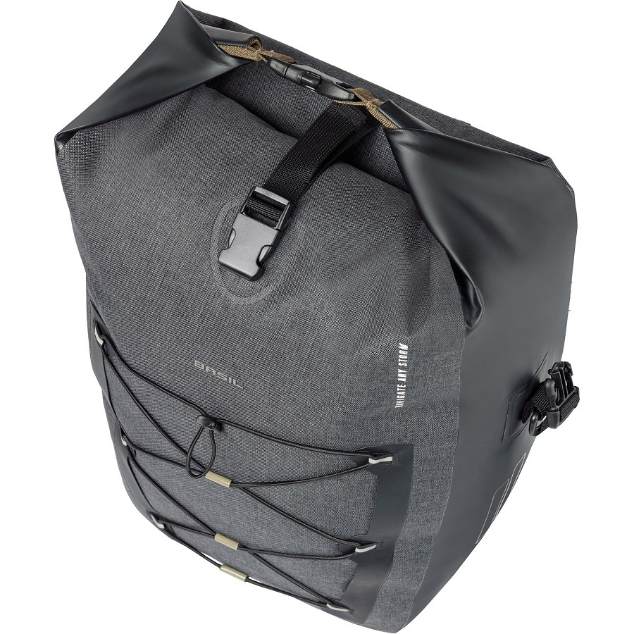 De Navigator Storm van Basil is een sportieve, waterdichte (IPX3) enkele fietstas, uitgevoerd in het zwart/donkergrijs met legergroene details. De fietstas in maat L heeft een inhoud van 25 tot 31 liter en een roltopsluiting, een afneembare schouderband en een handig opbergelastiek op de voorkant. De tas is gemakkelijk aan de fiets te bevestigen met het MIK Hooks-systeem.