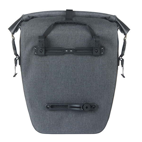 De tas heeft een ruim hoofdvak dat sluit met een waterbestendige roltopsluiting met klikgespen. Deze roltopsluiting kunt u naar de achterkant van de tas oprollen, of bovenop de tas. De klikgespen zijn daarbij flexibel in te zetten. Op de voorkant van de tas zit een verstelbaar, reflecterend opbergelastiek, waar u heel handig een natte regenjas of een fietshelm achter kunt opbergen. De achterkant van de tas is verstevigd met een harde achterplaat en de tas is aan drie zijden voorzien van reflecterende elementen.