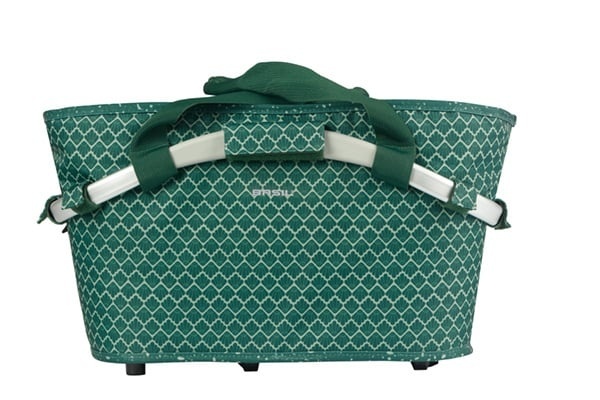 De Flair Carry All Rear Basket van Basil is een trendy, lichtgewicht fietsmand voor achterop de fiets. De afneembare stoffen mand biedt ruimte voor 22 liter aan spullen en is gemaakt van sterk, waterafstotend gerecycled polyester. De Flair is uitgevoerd in het donkergroen, met een lichtgroene retro print geïnspireerd op de jaren '70.