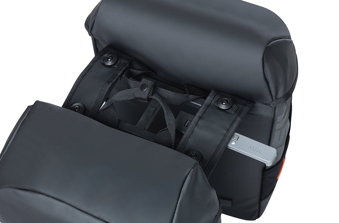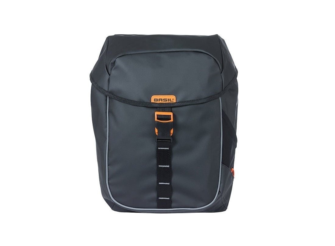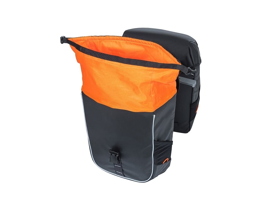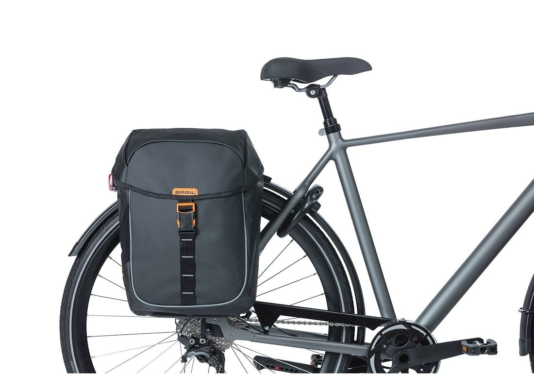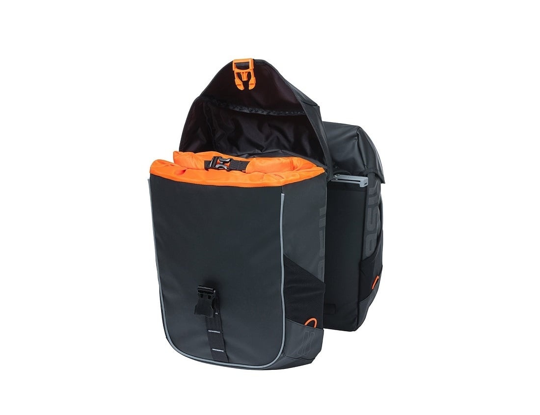 Deze kwalitatief hoogwaardige, sportieve dubbele fietstas van Basil is een ware aanwinst voor op de fiets. De tas is ruim (34 liter inhoud) en gemakkelijk op de fiets te bevestigen én van de fiets te halen met het MIK 2.0-bevestigingssysteem. De tas is gemaakt van waterdicht tarpaulin, en uitgevoerd in het zwart met oranje accenten en een oranje binnenvoering.