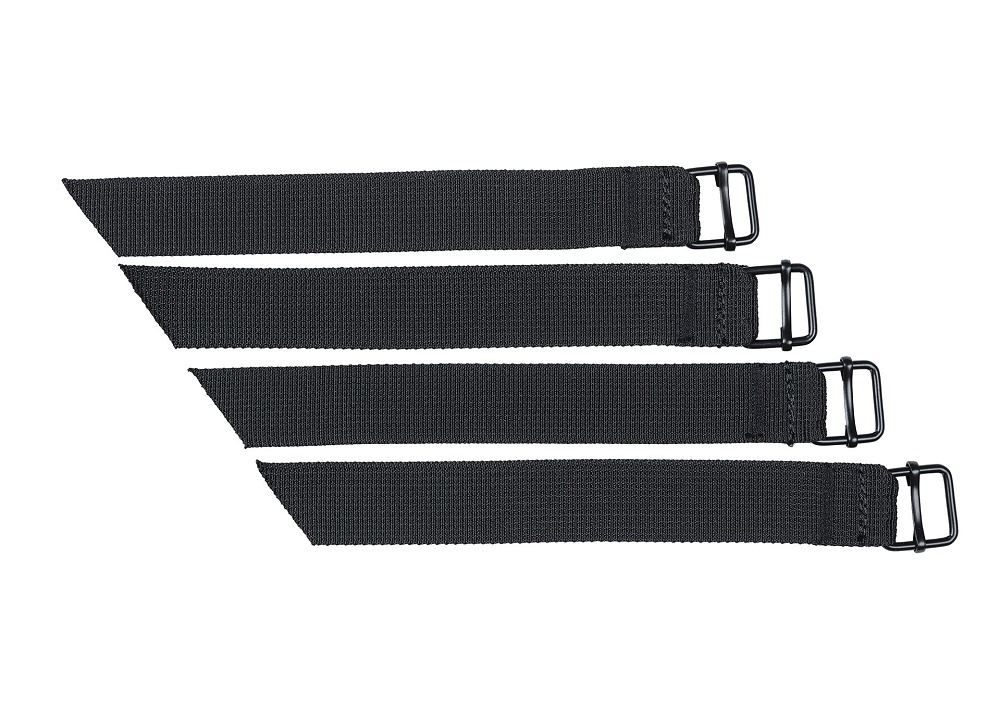 Een set van vier zwarte riempjes voor het bevestigen van dubbele fietstassen met het Basil Universal Bridge-systeem. De riempjes dienen ter vervanging, voor als er een riempje stuk is of is kwijtgeraakt.