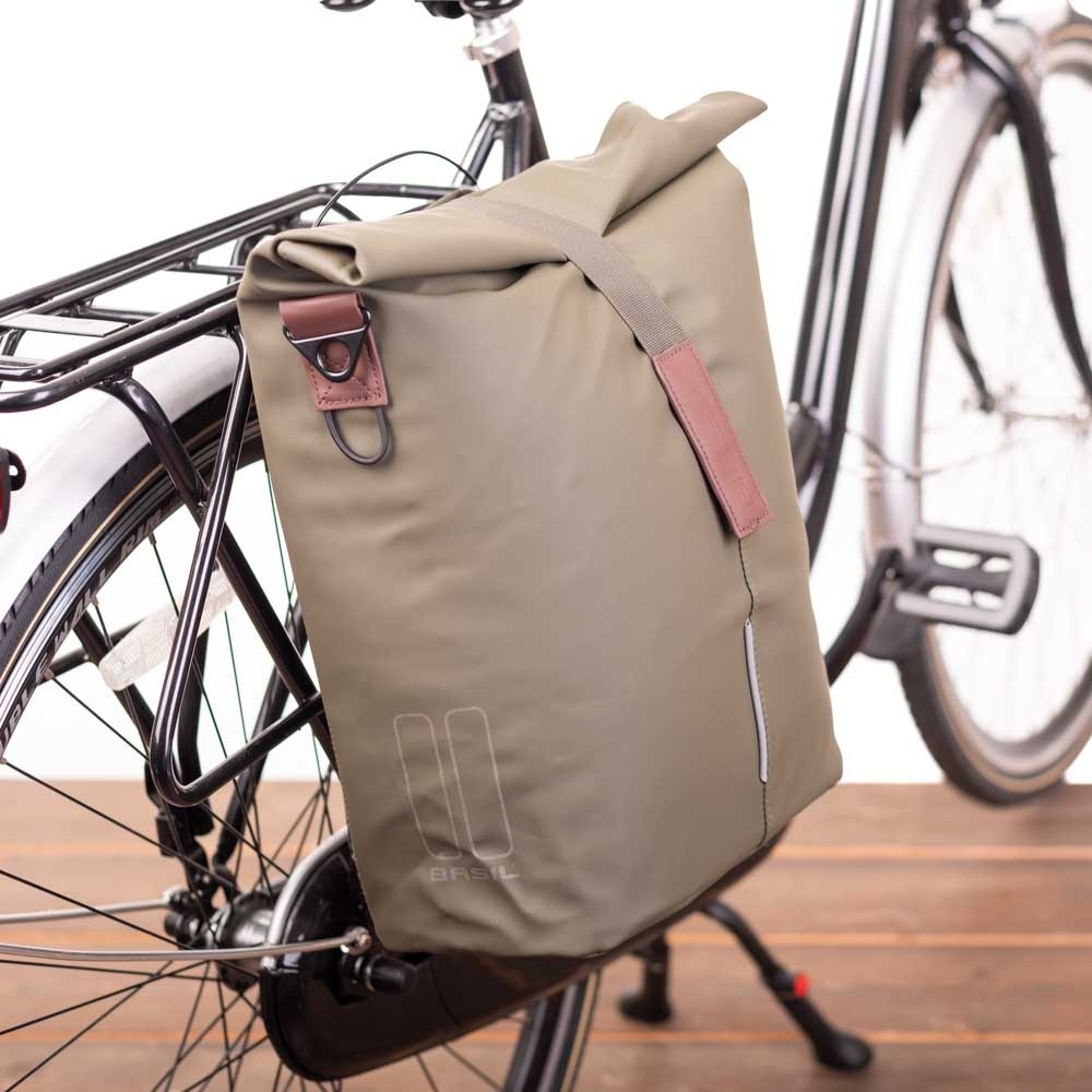 Deze mosgroene enkele fietstas en schoudertas van Basil is zeer praktisch, en nog modieus en elegant ook. De Shopper City heeft een inhoud van 14 tot 16 liter, een waterbestendige vouwsluiting en MIK Studs-bevestiging.
