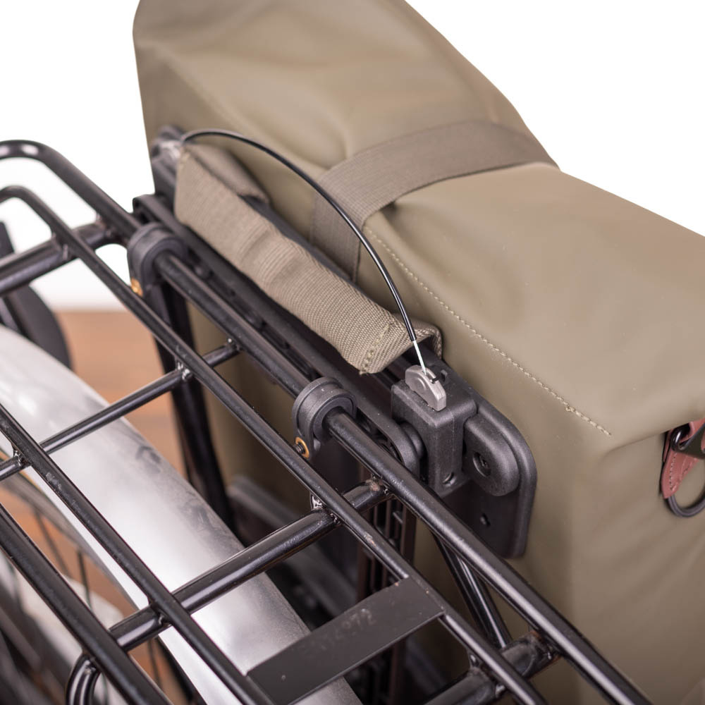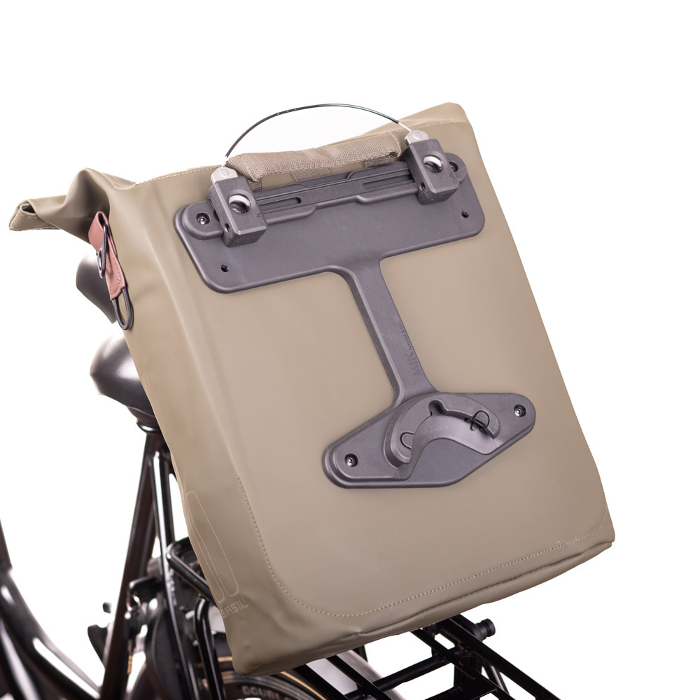 De achterkant van de tas is voorzien van een MIK Studs-adapter waarmee de tas eenvoudig aan de fiets bevestigd kan worden. Hiervoor is een drager met drie montagepunten nodig. Wanneer u niet over een dergelijke drager beschikt, kunt u met behulp van de apart verkrijgbare MIK Studs Frame adapter toch gebruikmaken van dit handige systeem. Met MIK Studs kun je niet alleen een tas of mand op de bagagedrager plaatsen, maar ook extra tassen aan de zijkant van de drager vastklikken. Meer informatie over het MIK Studs-systeem leest u hier.