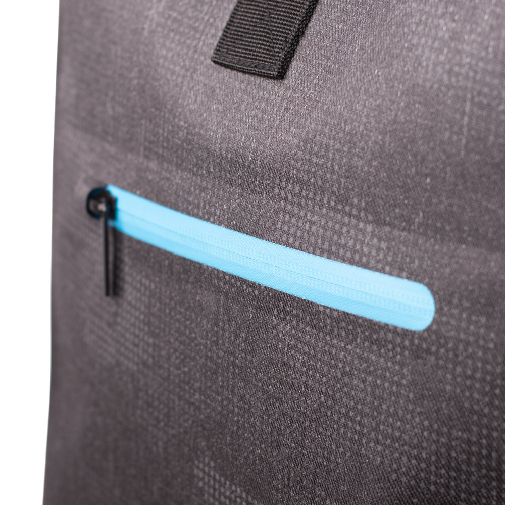 Het ruime hoofdvak van de tas sluit met een magnetische rolsluiting, die u vastzet met een klikgesp. De rolsluiting kan hoger of lager worden vastgemaakt, waardoor het volume van de tas kan variëren van 15 tot 20 liter inhoud. Achterin het hoofdvak zit een gevoerd laptopcompartiment en de tas heeft een verharde achterplaat. Op de voorkant van de tas zit een ritsvakje met een waterafstotende ritssluiting in een contrasterende blauwe kleur.