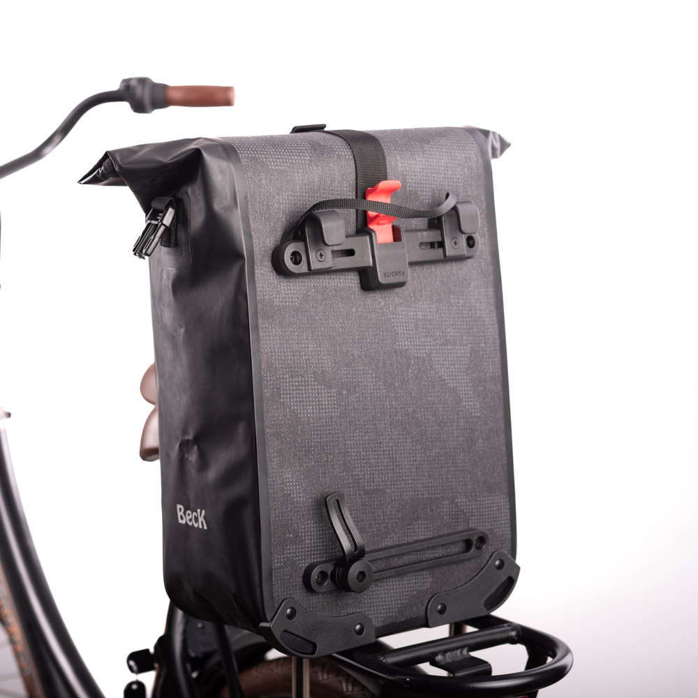 De enkele fietstas is eenvoudig aan de bagagedrager vast te maken met ronde KLICKfix-klemhaken. Deze haken zijn horizontaal te verplaatsen. Een draaibare klemhaak onderaan op de achterplaat houdt de tas netjes op zijn plek. De fietstas is ook geschikt voor gebruik op een e-bike. Wanneer u te voet verder gaat, draagt u de tas gemakkelijk met u mee aan de bijgeleverde verstelbare schouderband. Deze bevestigt u met klikgespen aan de tas.