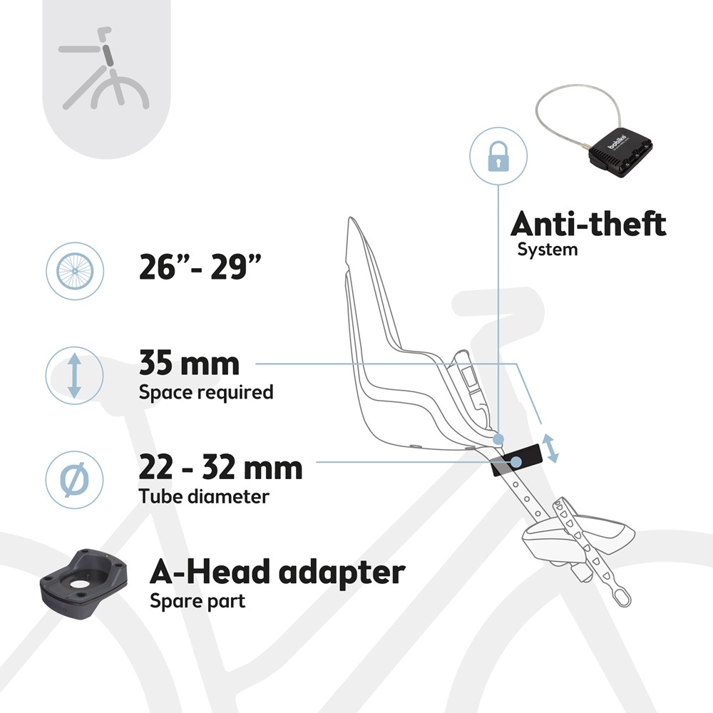 Dit fietszitje van Hollandse bodem wordt geleverd inclusief het benodigde montagemateriaal. Hiermee kan het zitje passend worden gemaakt voor zowel smallere als bredere stuurpennen. De ONE Mini is geschikt voor standaard stuurbuizen met een diameter van 22-32 mm, en MTB-stuurbuizen van 1-1/8 inch. Voor een goede montage is een minimale balhoofdbuislengte van 35 mm vereist. Heeft u een fiets met Ahead balhoofdstel? Dan biedt de Bobike A-Head Adapter uitkomst. Zie de gerelateerde producten onderaan de pagina.