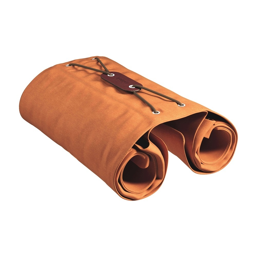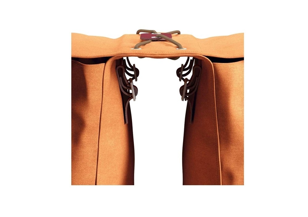 De oranje tas is gemaakt van katoenen canvas met een waterafstotende coating, en is voorzien van bruine leren details. De ruime hoofdvakken van de tas sluiten met een grote klep met een leren bandje en een drukknoop. Op de brug van de tas zit een gekruist bruin elastiek, waaronder u extra spullen kunt opbergen, zoals een jas. Is de tas even niet in gebruik? Dan rolt u 'm op en neemt u de tas gemakkelijk mee.