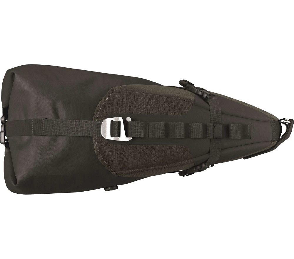 U bevestigt de houder van de zadeltas met klittenband aan de zadelpen van uw fiets. De houder van de tas kan aan de zadelpen blijven zitten, de dry bag pakt u er gemakkelijk uit.