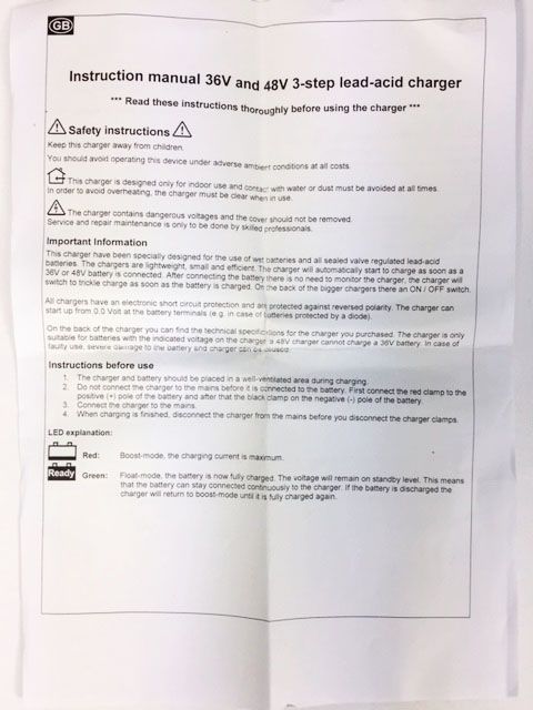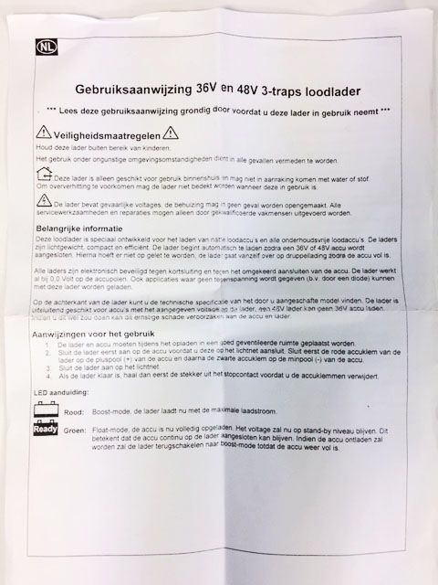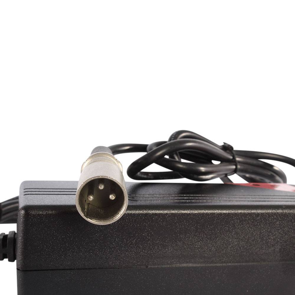 De lader is uitgerust met een 3 pins stekker aan de uitgaande zijde. Deze acculader is daarmee geschikt om aan te sluiten aan de meestgebruikte toepassingen voor 36V accu's zoals scootmobiels, elektrische scooters en soortgelijke voertuigen.