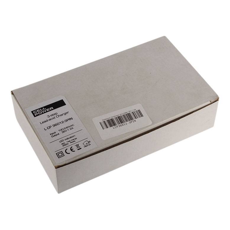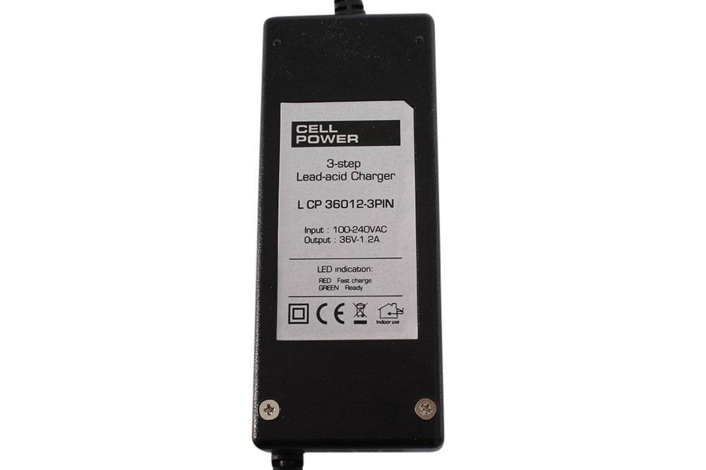 36V acculader van Cellpower met een laadvermogen van 1,2A. Deze lader is geschikt voor het laden van 36V droge loodzuur accu's tot ongeveer 40Ah.