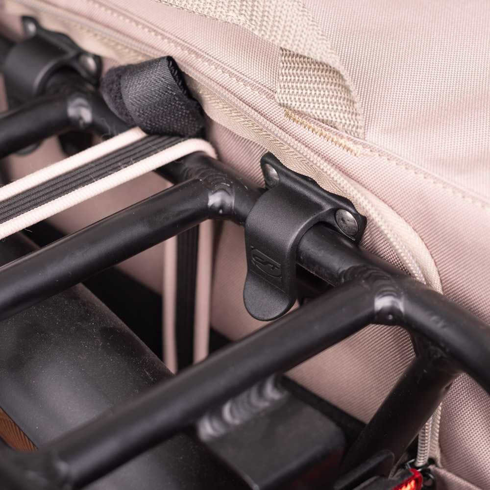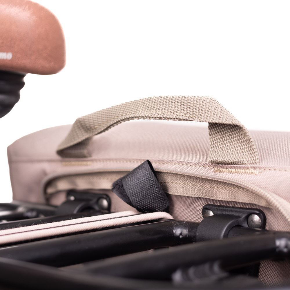 U bevestigt de tas heel eenvoudig met de bevestigingshaken aan de drager van uw fiets, en de tas is net zo makkelijk weer van de drager af te halen. Wanneer u de haken niet gebruikt, bijvoorbeeld wanneer u de tas als schoudertas of pakaftas meeneemt, kunnen deze netjes worden weggewerkt achter een ritsvak.