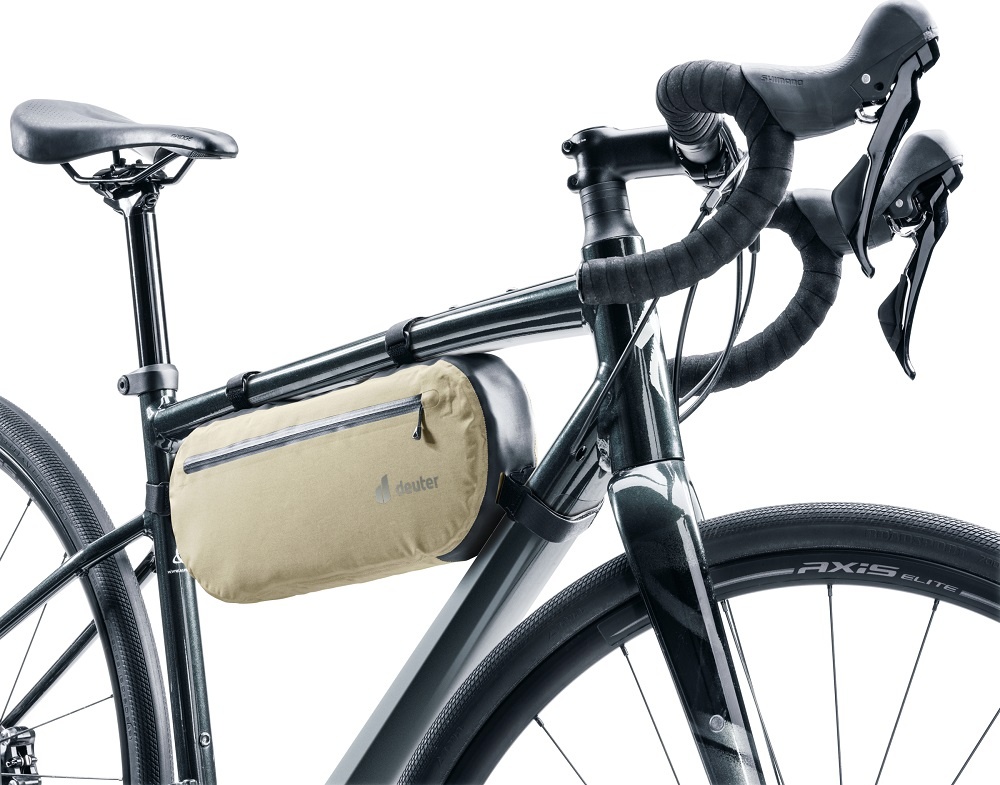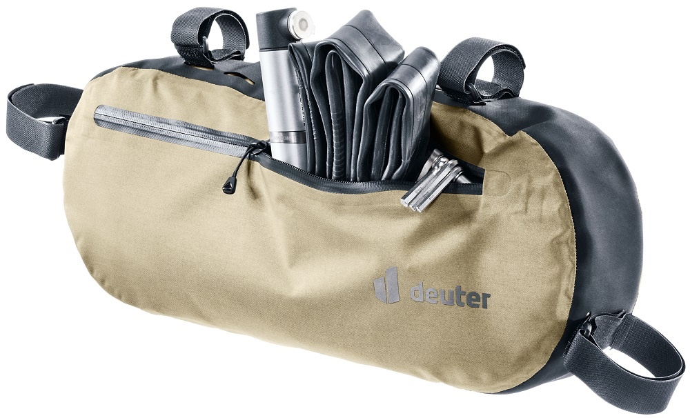 Een sportieve, lichtgewicht frametas van Deuter voor in het frame van uw fiets of mountainbike. De beige/kaki frametas heeft een inhoud van ca. 6 liter en is ideaal voor het opbergen van bijvoorbeeld gereedschap en een reserveband.
