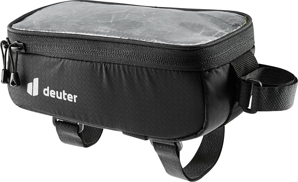 Een stevige telefoontas van het merk Deuter, voor op de bovenbuis van het frame van de fiets. De zwarte Phone Bag 0.7 heeft een transparant touchscreen venster, een geïntegreerde regenhoes en een inhoud van 0,7 liter. Aan het frame te bevestigen met klittenband.