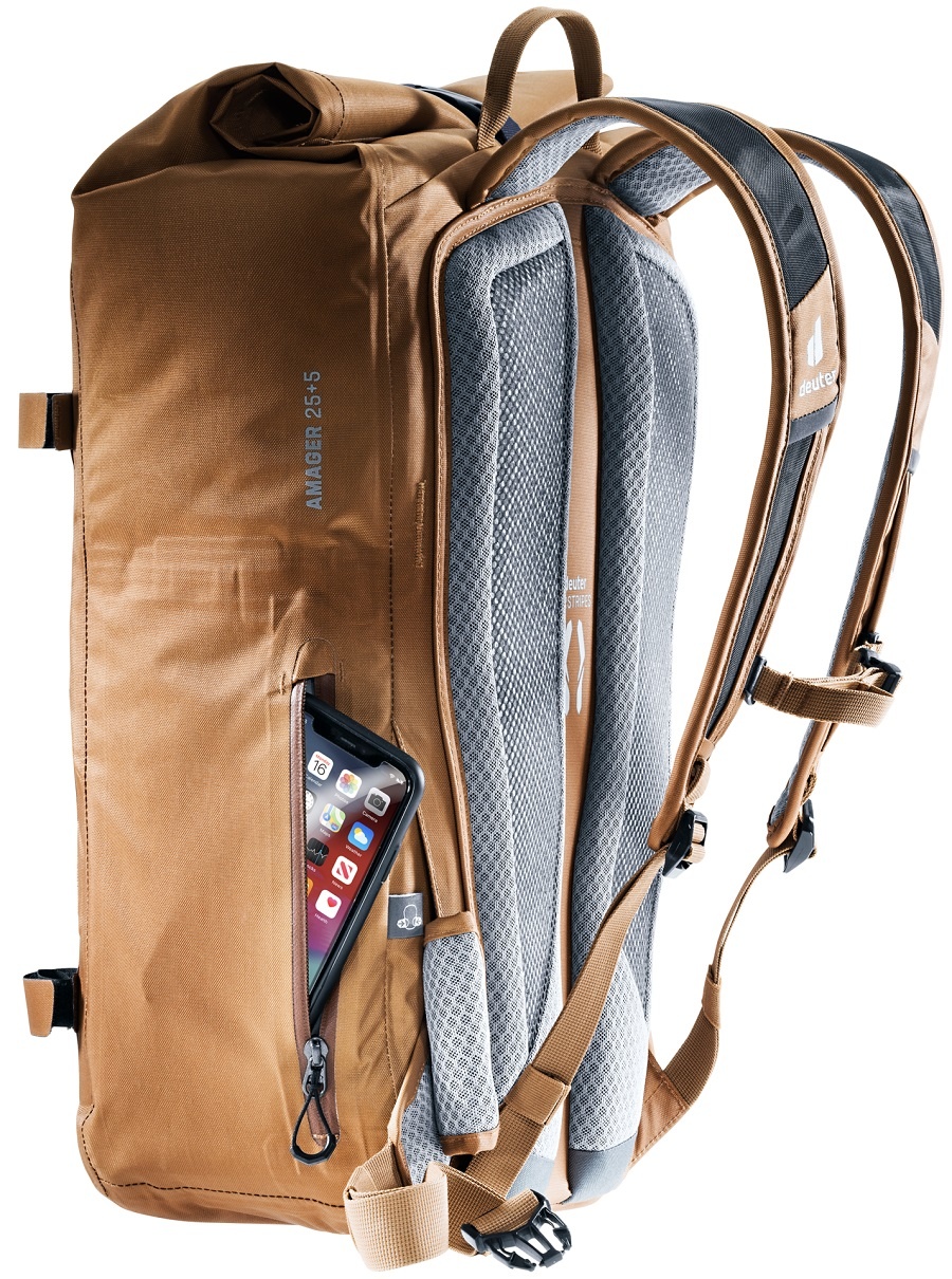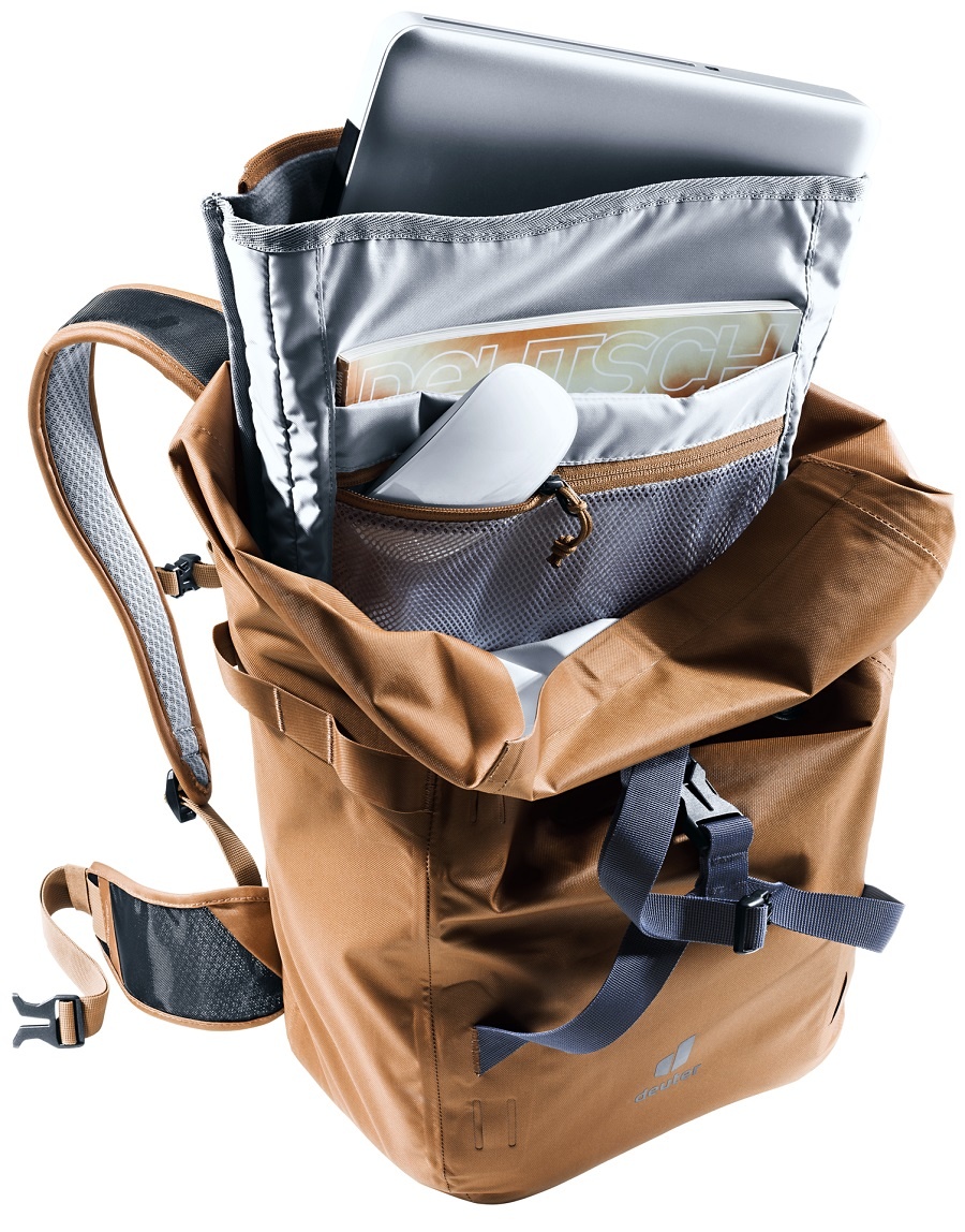 Rugtas Amager biedt met zijn 25 liter inhoud veel opbergruimte, onderverdeeld in praktische opbergvakken. In het hoofdvak vindt u een gevoerd laptopvak (geschikt voor de meeste laptops tot 15 inch), nog een steekvak voor papieren of een tablet en een ritsvakje van gaas. Het laptopcompartiment is uitneembaar dankzij een rits. De tas heeft een waterproof rolsluiting, met een magneetsluiting en een klikgesp. De hoogte van de tas is afhankelijk van de hoeveelheid bagage die u meeneemt: hoe minder u meeneemt, hoe compacter de tas. Achter de grijze band op de voorkant van de tas kunt u een jas of helm opbergen. En uw smartphone bergt u handig op in een ritsvakje aan de zijkant van de tas.