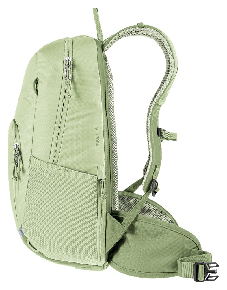 De Bike I 16 biedt met zijn 16 liter inhoud veel opbergruimte, onderverdeeld in praktische opbergvakken. In het voorste ritsvak vindt u een handige organiser voor het opbergen van kleinere spullen en gereedschap, in een paar steekvakjes van mesh en een ritsvak met een sleutelclip. In het ruime hoofdvak, dat sluit met een rits, vindt u een groot steekvak. In dit vak kan eventueel een 3 liter drinkreservoir (niet inbegrepen) worden opgeborgen; er is een speciale uitgang voor de drinkslang. Er zit een ritsvakje aan de zijkant van de tas voor het opbergen van een smartphone en/of kaart. En dan zijn er nog twee elastische vakken op de zijkanten van de tas.