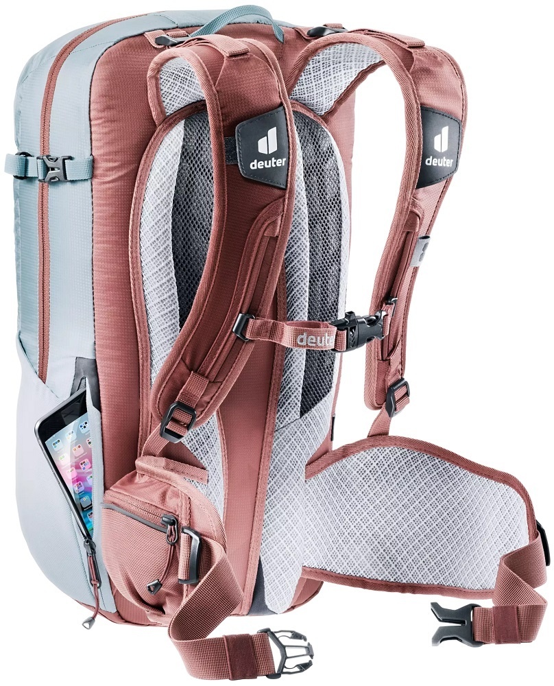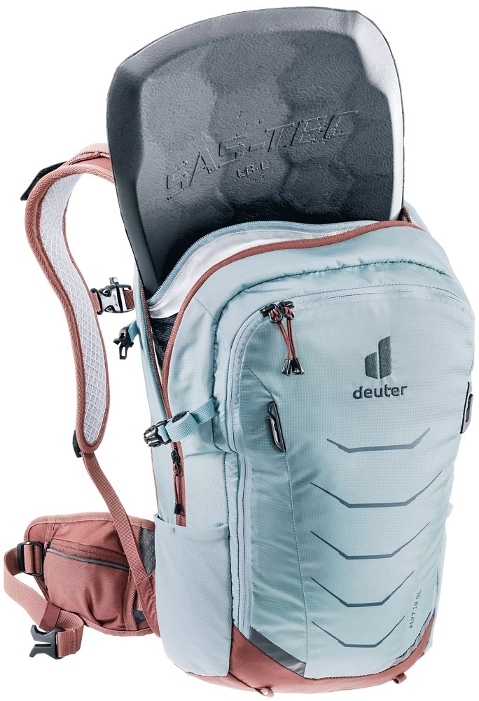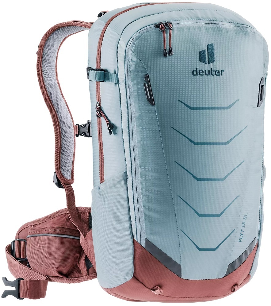 De Flyt 18 SL uit de Flyt-serie van Deuter is een fietsrugzak voor dames, gemaakt van duurzame materialen. De rugzak, in de kleuren lichtblauw en rood, is voorzien van het innovatieve Airstripes-rugsysteem dat zorgt voor optimale ventilatie. De rugzak heeft een inhoud van 18 liter en beschikt over praktische opbergvakken, een regenhoes, helmhouder en een uitneembare rugprotector. Een heel complete rugtas voor intensieve en avontuurlijke (downhill) mountainbiketochten.