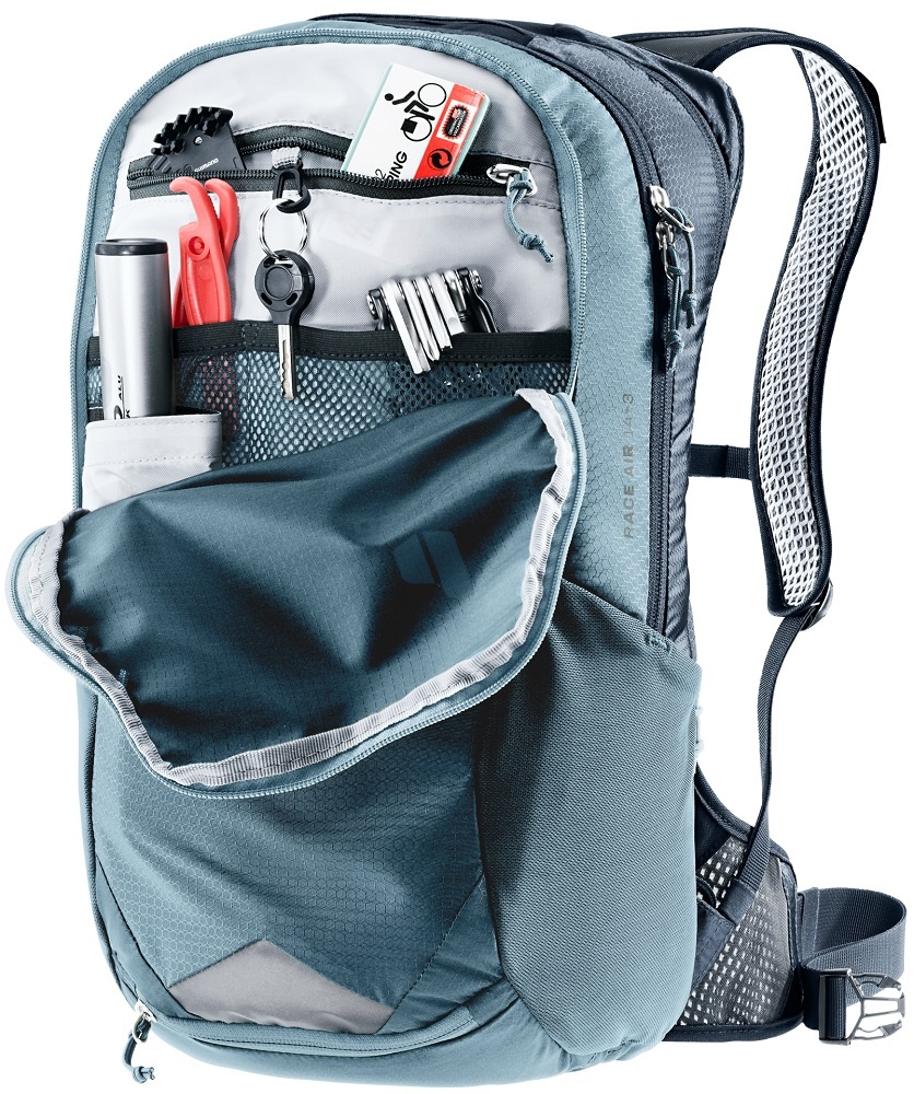 De Race Air biedt met zijn 14 liter inhoud veel opbergruimte, onderverdeeld in praktische opbergvakken. In het voorste ritsvak vindt u een handige organiser voor het opbergen van kleinere spullen en gereedschap, in diverse steekvakjes en een ritsvak met een sleutelclip. Zo kunt u alles overzichtelijk indelen. De tas beschikt over een ruim hoofdvak met daarin een steekvak waarin u bijvoorbeeld een 3 liter drinksysteem (niet inbegrepen) kunt plaatsen. Er is een speciale uitgang voor een drinkslang. Wanneer u de ritssluiting achter het hoofdvak rondom los ritst, vergroot u het volume van het hoofdvak met nog eens 3 liter. Aan een van de zijkanten zit een klein ritsvak waarin u veilig uw smartphone kunt opbergen. En dan zijn er nog twee elastische vakken op de zijkanten van de tas.