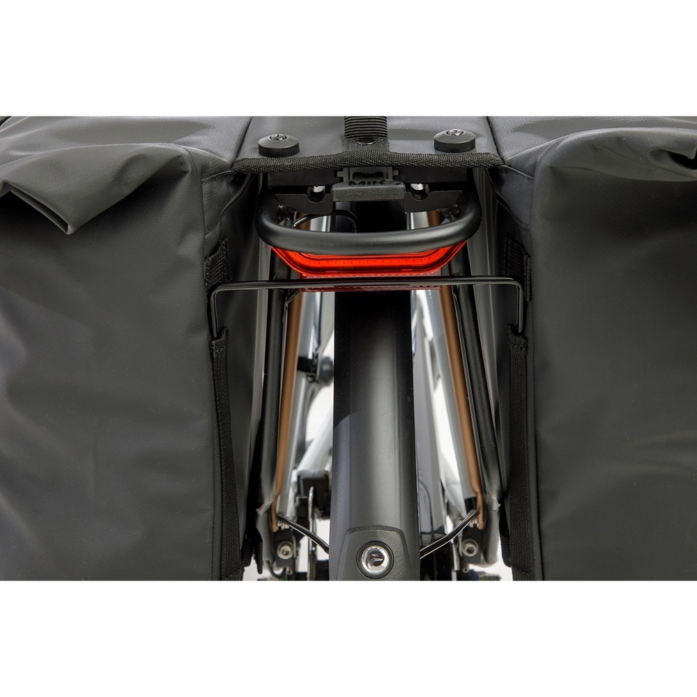 De tas is gemaakt van waterafstotend bisonyl en heeft een waterproof vouwsluiting, waardoor deze bestand is tegen een kleine regenbui. Door de gestikte naden is de tas echter niet 100% waterdicht. Om de tas volledig waterdicht te maken, kunt u de New Looxs-regenhoes voor dubbele fietstassen erbij bestellen.