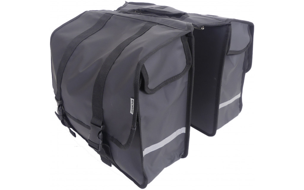 Deze zwarte dubbele Transporter van het merk Edge is gemaakt van sterk, waterafstotend bisonyl en biedt ruimte voor 40 liter aan spullen. De tas is voorzien van reflectie en regenoren, en is gemakkelijk aan de bagagedrager te bevestigen met riempjes. Een praktische, stevige en betaalbare dubbele fietstas!